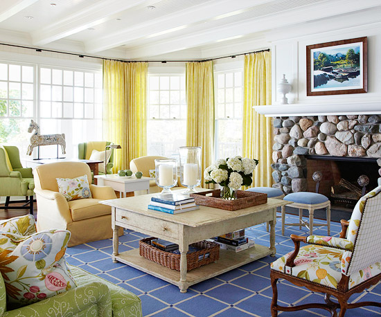 Although the furniture in this cheerful cottage living room might look like a matched set, the sofa, chair, and table are actually individual pieces picked up over time and united with a little elbow grease and paint, plus newly covered cushions.